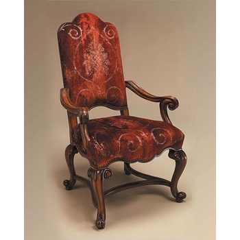 Hand Carved Frontier Finished Armchair, Rust Patterned Velvet Upholstery