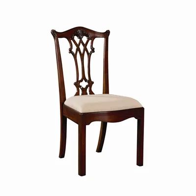 Carved Aged Regency Finished Mahogany Chippendale Straight Leg Side Chair, Caramel Fabric