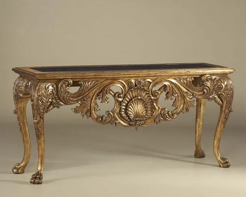 Carved Light Tone Finished Console Table, Golden Galaxy Stone Top