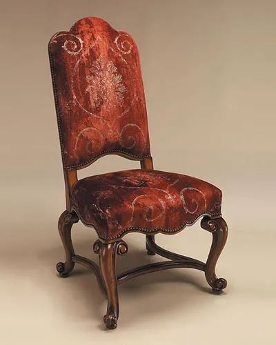 Hand Carved Frontier Finished Side Chair, Rust Patterned Velvet Upholstery